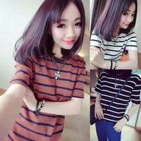 2016韩版休闲简约百搭学院风条纹打底衫夏装新款宽松短袖T恤女