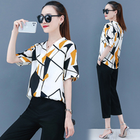 2020夏季女短袖雪纺衬衫2020新款搭配阔腿裤裙子的高腰短装套装