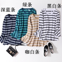 T恤裙新款韩版条纹女夏薄圆领喇叭荷叶短袖修身中长款大码连衣裙