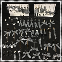 MMOESTUDIO学院少女黑白格子丝带耳环无耳洞耳夹蝴蝶结耳饰布艺
