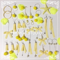 MMOESTUDIO暖色柠檬黄色格子毛球丝带耳环无耳洞耳夹可爱温柔淑女