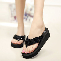 2018新款松糕夹脚拖鞋女坡跟厚底黑色亮片防滑凉拖鞋夏季女人字拖