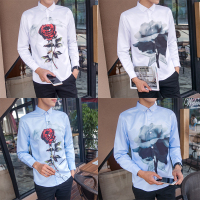 2017港仔夏季韩版玫瑰花印花长袖衬衫男修身白衬衣9.9元包邮特价