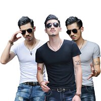 男士纯黑色加大码T恤净色贴身体桖打底衫紧身内衣短袖半袖V领T恤