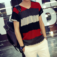 短袖男潮韩版日系 夏季修身V领半袖薄款条纹 青少年百搭个性T恤男